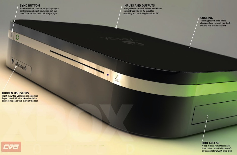 We’ll assume this lower-end Xbox Next will actually come without a disc drive and be totally download-only, but with somewhere around 32GB of memory built-in for downloading games and movies. You can hook up a standard 360 or Xbox Next controller to it, but it’ll only come with a remote in the box to keep the price below $200.