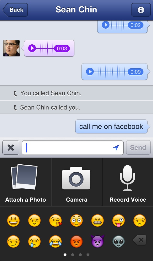 The way voice calls are integrated into your usual chat sessions is very fluid. You tap the “+” icon as you would if you wanted to add a photo to a conversation, and you’re greeted with the new option to “Record Voice”. Tapping that gives you a push-to-talk style button which you hold down during your speaking time. This is probably so that the audio clip is as short as possible so that it doesn’t chew through a heck of a lot of data. Good move on Facebook’s part there.