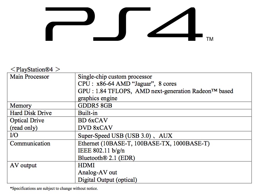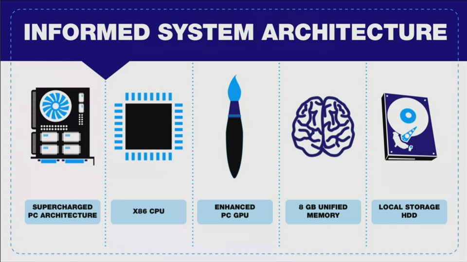 “We were able to create in PlayStation 4 a system by game creators, for game creators,” Cerny said. The system runs on a pretty standard x86 architecture, a “highly enhanced” PC graphics processor, copious amounts of hard disk space (we’d guess a terabyte or so, if Sony has it’s way with features of the console), and 8GB of RAM.