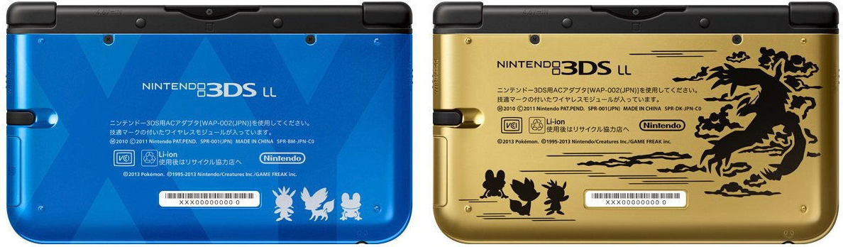 The top of the gold design features Xerneas alongside the three starter Pokémon, Chespin, Fennekin, and Froakie, with Yveltal on the back with three more silhouettes of the starters. The blue design features both legendaries side by side and large X and Y lettering superimposed on the front and back of the device.