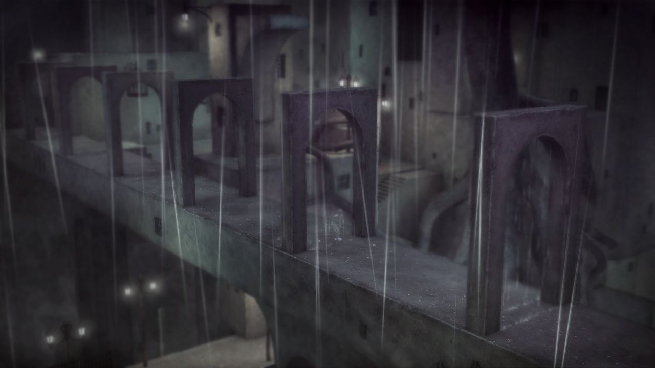At the start of the game, how players interact with the rain is simple. Monsters can see the boy when they stand in the rain, but the boy will become invisible from view when he stands under many conveniently-placed awnings, verandas and balconies. The initial gameplay portions are just about staying out of the rain to avoid being eliminated by the formless beasts that seem to have the same condition that your protagonist does, only being rendered visible by the raindrops.