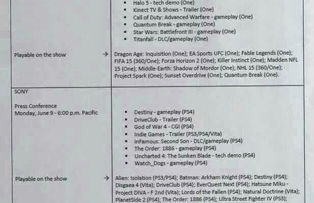 The document (see it in full below), purports that Sony will begin their conference with Destiny and Driveclub, two titles that they had at their conference last year, before going into God of War 4, some indie game trailers, and a CGI trailer of Uncharted 4. They’ll then, apparently, wrap with Watch Dogs, a game that, by the time E3 rolls around, will have been out for three weeks.
