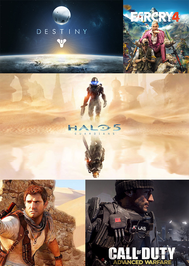 Halo 5: Guardians • Uncharted • Zelda Wii U • Destiny • Far Cry 4 • Assassin’s Creed Unity • Pokémon Omega Ruby & Alpha Sapphire • Smash Bros. • Batman: Arkham Knight • Civilization: After Earth • Borderlands: The Pre-Sequel • Metal Gear Solid V: The Phantom Pain • The Order: 1886 • Tom Clancy’s The Division • Call of Duty: Advanced Warfare