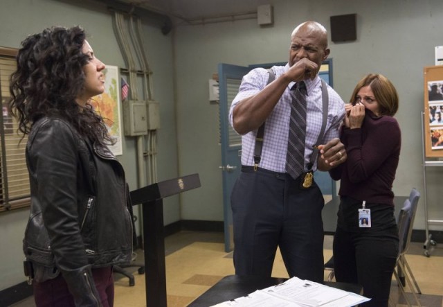 Likewise, the equally inevitable indication that Santiago shared Peralta’s since-buried romantic affections also hit with a surprising whimper. The show thankfully avoided the low-hanging fruit of having Jake and Sophia fight over that, even if Sophia does initially storm off at Santiago being busted, but it’s a warning sign that the Peralta/Santiago drama may be back soon. That’s frustrating, since Peralta is clearly a great match with Sophia, and they’re an adorable couple, even when they end up sleeping in a hotel suite full of a thousand creepy dolls. Don’t ask.