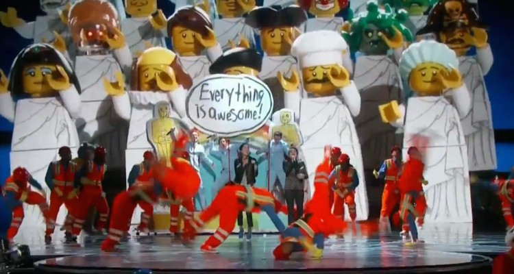 The gig was made even more spectacular by the dozens of characters dressed up as LEGO cowboys, spacemen, and construction workers, some of which handed out LEGO Oscar statues to celebrities in the first few rows.