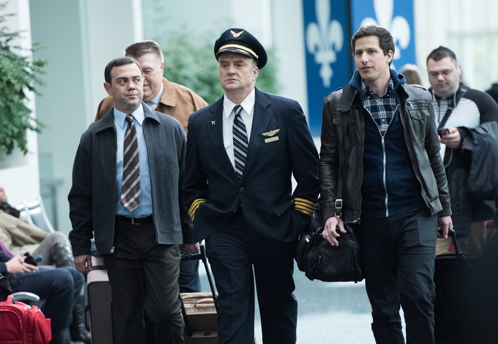 The main plot of the episode involves Captain Peralta apparently getting framed for smuggling prescription drugs into Canada. This could cost him his pilots’ license, so Peralta, eager to make up for the fact that his dad left him at a young age, leaps onto the case in an effort to clear his father’s name, dragging Boyle along, as well as Scully, who apparently speaks French, which the Quebec authorities exclusively speak for some reason. Being Canadian myself, I’m pretty sure that most any Quebec authorities actually speak both English and French, since that’s a requirement to work any kind of government or law enforcement job in that province, but whatever. This is an American show, so I’ll let that slide.