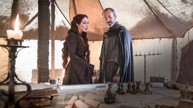 In any case, while this is going on at The Wall, Stannis continues his march to Winterfell, against the counsel of Ser Davos. With Stannis’ army sick and dying, and an entire platoon of his sellswords deserting him, Stannis stubbornly continues on, despite his once-superior forces now appearing to dwindle as he continues toward the Boltons. Even as Davos advises him to return to Castle Black, Stannis refuses, claiming that the Winter would delay the march for years. Consulting Melisandre, Stannis is told that he will achieve victory, though Melisandre demands the sacrifice of Stannis’ daughter in return. This was the one point when Stannis seemed to shimmer with any degree of humanity, as he disgustedly tells Melisandre to get out of his tent. Still, Melisandre does have a habit of getting her way in the long-term… It’s possible that Shireen might want to start worrying. Again, why in the world did Stannis think that forcing his wife and Greyscale-afflicted daughter to march with his army was a good idea?!