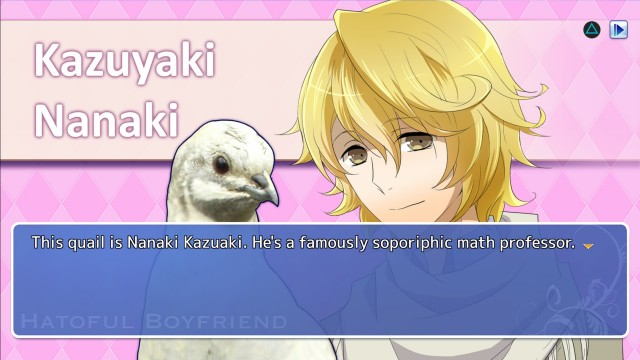 Hatoful Boyfriend is part of a Japanese gaming subgenre called ‘Otome’, which is a word with no direct English translation, referencing video games that are primarily designed for women. Otome games tend to involve female-friendly themes like romance and companionship, and virtually always star female protagonists. A male player with a sense of humour can still enjoy Hatoful Boyfriend for what it is, mind you, even if it’s designed from the ground up to primarily appeal to a female audience, and is part of a genre that pretty much only exists to Japan.