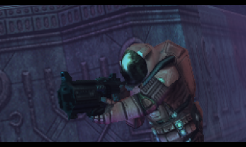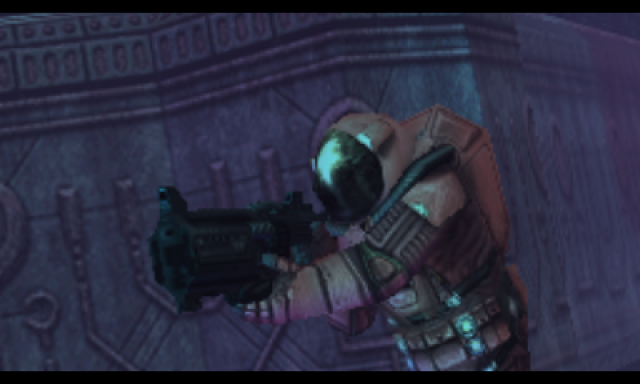 Fortunately, even though environments are easy to navigate, especially with the handy Touch Screen map to consult throughout most of the game, there are a few hidden nooks and crannies to poke at, which can contain bonuses like health and weapon upgrades, as well as Alien Artifacts that can be used to unlock special challenge-based bonus missions, if you assemble a full set of three in one Chapter by finding enough ways to explore off the linear path. This is mainly done by use of the RAD, or Remote Access Drone, which Kane can dispatch with a quick tap of Down on the Control Pad. Using the RAD, players can move through tiny tunnels and sneak around foes (which can be stunned, but not destroyed by the drone), tracking down orange nodes that can be stunned to disable force fields that would otherwise prevent Kane from moving forward. The force field puzzles may feel like a nuisance to some, but in the later episodes especially, they’re wisely not overused, only showing up every so often in the interest of either hunting collectibles, or varying the gameplay beyond moving through corridors and shooting whatever sentries are in your way.