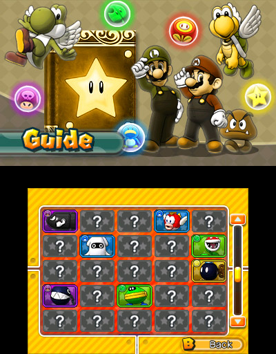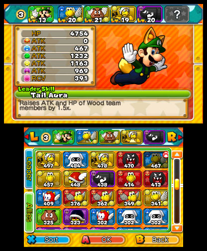 As with the original mobile game, both Puzzle & Dragons Z and Puzzle & Dragons: Super Mario Bros. Edition have players assembling a customized squad of monsters, with a ‘Leader’ that can grant them a special attribute, along with a ‘Helper’ that can grant another attribute, as well as assist in attacks when you match orbs with their selective elemental affinity. In Puzzle & Dragons Z, Leaders can be any old monster you choose, while Helpers are human allies that you can meet in the story, or ally with using StreetPass tags (granting a tag’s preferred ‘Leader’ monster to fill the role of your ‘Helper’ monster when selected), but in Puzzle & Dragons: Super Mario Bros. Edition, Leaders consist of specialized Mario personalities that you recruit as you beat stages, including various forms of Mario, Luigi, Toad or Yoshi, who also serve as Helpers to boot.