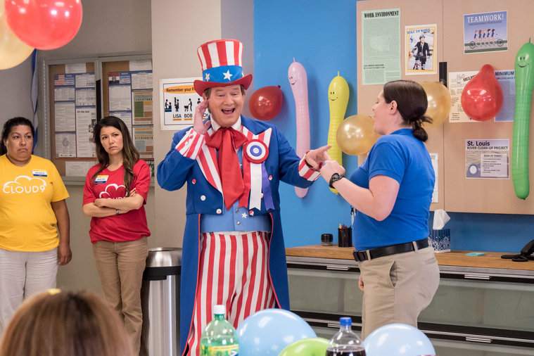There were still plenty of comedic highlights with the other employees beyond Garrett though, which still made “Color Wars” a good episode overall. The reveal that the normally silent, elderly employee, Brett is actually a sales machine who is so good, that he sells the very shelves that the items are on, is pretty amusing, as is the further fleshing out of the B-list Cloud 9 crew, including a re-appearance by the well-meaning, but downtrodden Sandra as she interrupts a Gold Team meeting by trying to put a crinkled bill in the vending machine. Superstore’s lead ensemble is starting to come together now, so it’s good that the show is starting to develop B-list employees to keep expanding the jokes beyond the series regulars. Hopefully, we keep seeing more of this, especially since it’s unlikely that Superstore isn’t getting a second season at this point, given the good reception and viewership.