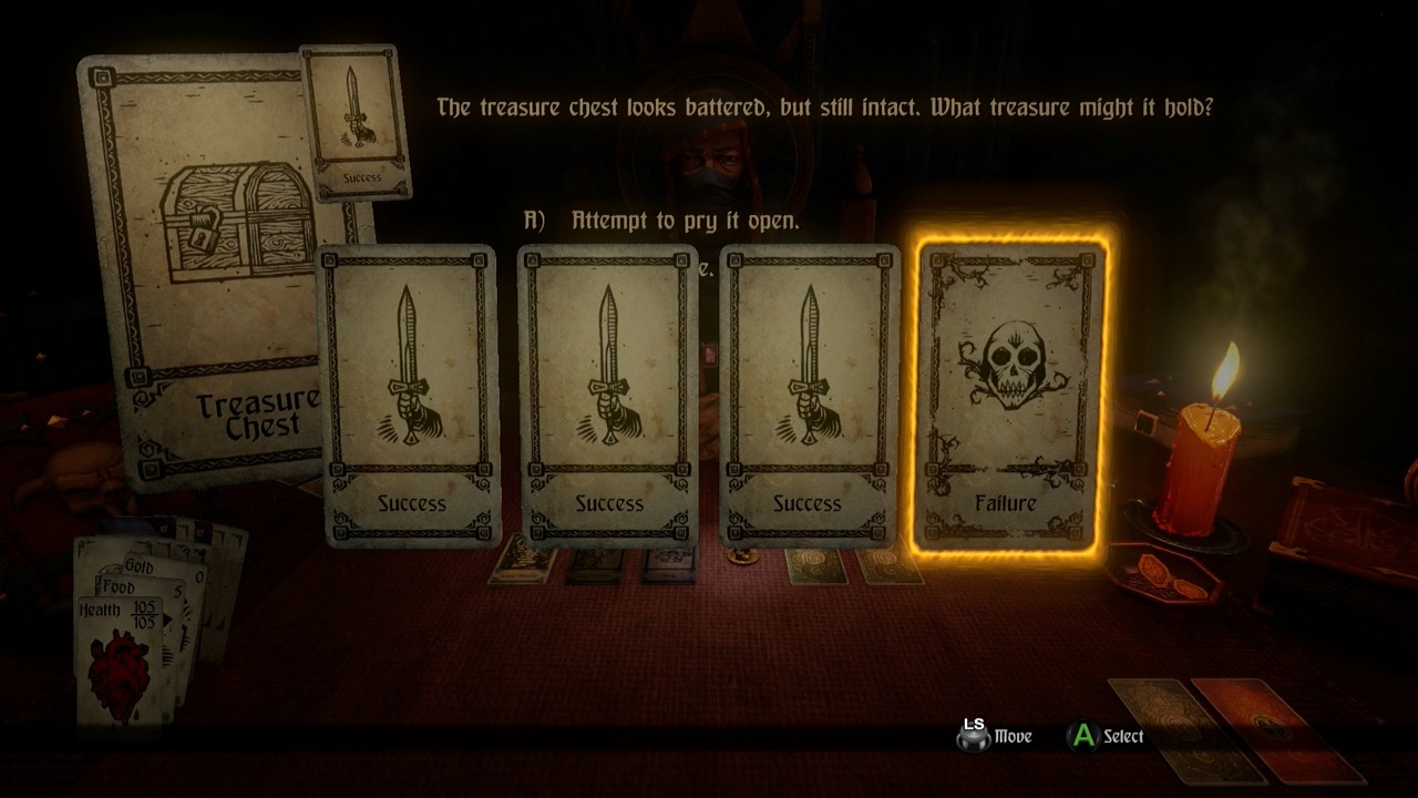 Sound effects are satisfactory, though only a handful of them stand out as being especially powerful. Combat can sometimes feel a little lightweight, though the game’s mightier attacks at least sound with the proper punch and fury. It’s especially satisfying to hear a triumphant, “Clang!” sound when you fell the last enemy in a combat scenario as well, which often accompanies a nice series of rewards for your deck of benefits. In fact, the audio cues for fortune and misfortune are some of the highlights of Hand of Fate’s sound design, as triumphant bell ringing signals blessings and fortune, just as harsh chords exacerbate failures and bad results. It makes every decision have an immediate emotional impact on the player, and keeps the thrills of leaving your fate in the hands of lady luck especially exciting!