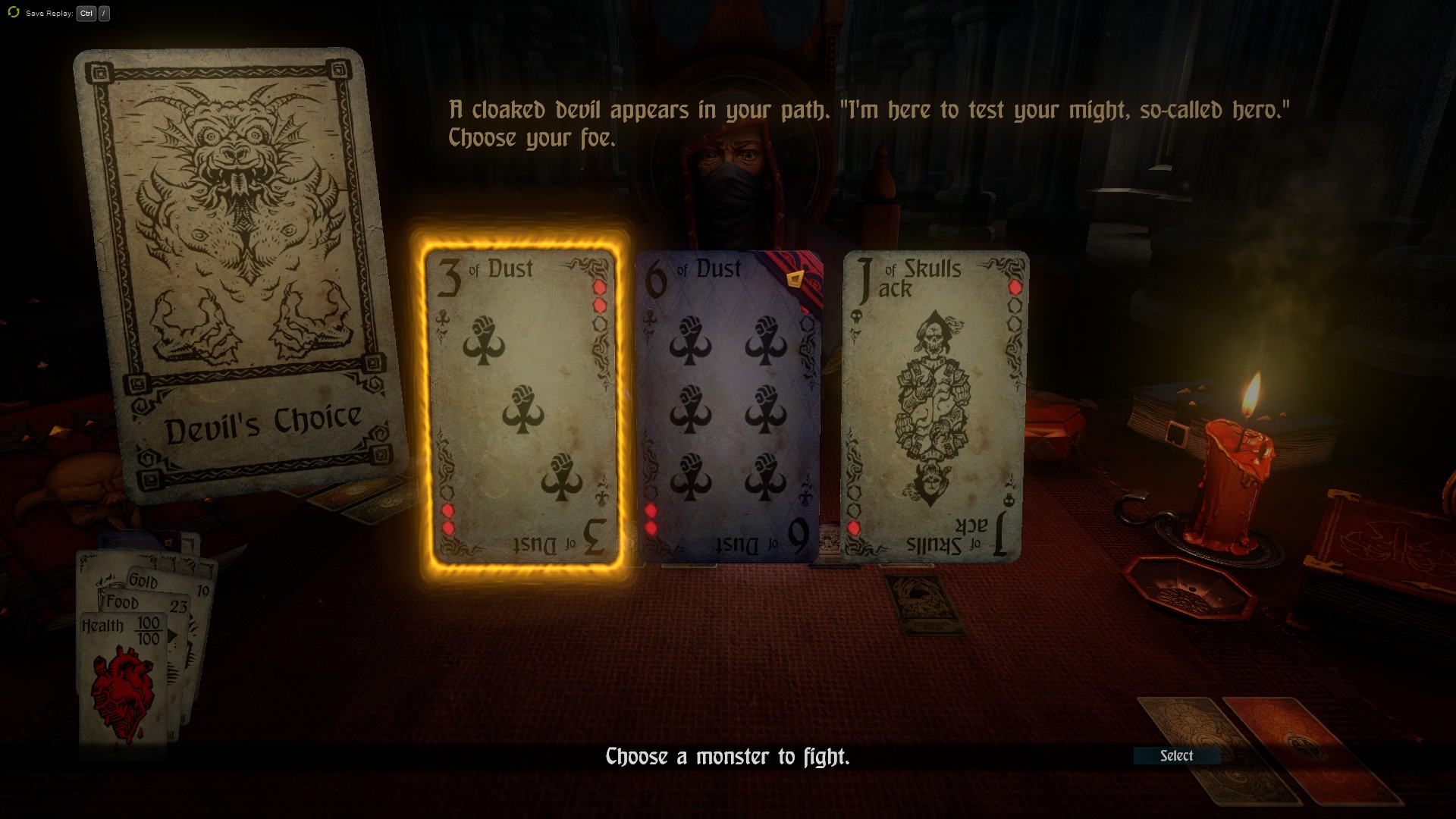 You have almost no means of directly healing yourself in combat proper either, even if you do slightly heal some HP with every step you take outside of combat, assuming you have a Food Card to eat, and the lack of healing options makes combat even more frustrating at times. There are special cards that you can find and equip to give you small healing boosts under certain conditions, but it might have been nice if Hand of Fate featured some sort of Health Potion cards or something to stockpile, to avoid combat becoming too annoying or unfair, which it sometimes is towards the end of Story Mode. As if that weren’t enough, losing all of your health and dying will kick you right back to the start of whichever round of Story Mode you were playing, or Endless Mode in general, in the case of that. There’s no mid-round checkpoints, so every decision you make and every step you take is important!