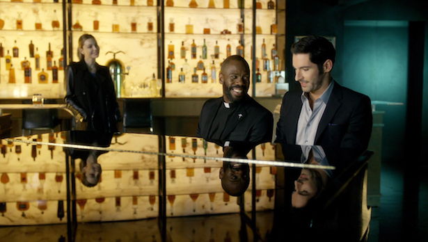 Even more effective is how Lucifer and the priest develop a friendship as the episode goes on. Lucifer doesn’t admit this of course, adamantly standing against priests on principle (obviously), though the charming scenes between Lucifer and the priest really speak for themselves. Things like the two musing over God and sin, playing the piano together, and enjoying the ambiance of Lucifer’s nightclub, ironically give Lucifer the fastest friend that he’s possibly ever made in the human world. This also came at an ideal time in the seasonal arc as well, since Lucifer has started to shun Maze after her scheming with Amenadiel, and there’s the slight implication that the loss of his demon companion has left Lucifer wanting for that similar sort of divine connection.