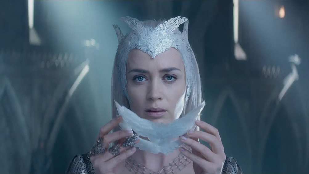 The main antagonist throughout most of The Huntsman: Winter’s War is actually Freya, played by Emily Blunt. Freya, despite ironically being named after the Norse goddess of love, is an avid hater of love, to the point where she runs a kingdom with the highest law of never falling in love. Yes, it’s pretty stupid, but I’ll get to that in the appropriate section. Freya also happens to be Ravenna’s sister, who has her own connection to her sister’s villainy, along with the power of Ravenna’s magic mirror, and also happens to have the power to generate and manipulate ice. While there have been obvious accusations of Freya’s character ripping off Elsa from Disney’s Frozen, and there are a handful of sequences in The Huntsman: Winter’s War that do tread rather closely to similar, more family-friendly sequences in Frozen, recall that Frozen is based off of a fairy tale itself, The Snow Queen. In this case, I think I’ll give Universal the benefit of the doubt and say that they probably felt that The Snow Queen was a logical fairy tale to connect to Snow White in a follow-up/spin-off/crossover mash-up of sorts, regardless of Frozen.