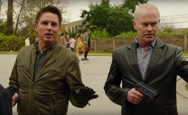 Everything comes together in a pretty enjoyable, action-packed climax in any case, with Sara, Nate, Ray, Jefferson and Amaya taking on Merlyn and Darhk at the city dump, which is where Lucas accidentally tossed Rip’s piece of the Spear of Destiny, the macguffin that the Legion was confirmed to be hunting by the end of the midseason finale. Reverse Flash eventually crashes the battle and subdues everyone, as well as snatching Rip, though the Legends at least manage to get away with the Spear piece and the Longinus Medallion that points them to the other pieces. That’s still a pretty big blow for the Legion to suffer, but Sara understandably takes it pretty hard that she couldn’t save Rip. It certainly doesn’t look good for the amnesiac Rip either, as the Legion prepares to torture him right as the episode ends, not knowing that Rip’s amnesia is genuine, and was the result of Rip directly touching the Waverider’s Time Drive to warp himself away from certain death during the season premiere, even if he had no control over where he went, and his entire memory and psychology would be re-written at the same time.