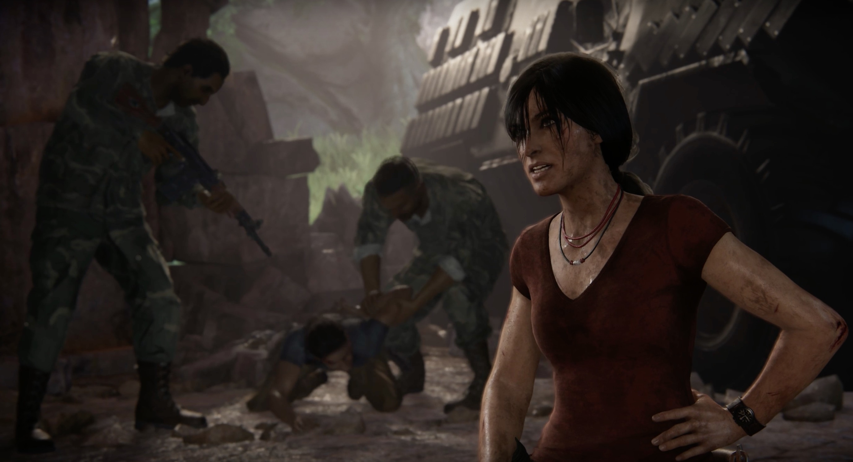 In pursuit by a war monger coup, the demo we saw of the game began atop a massive moss-covered boulder overlooking green jungle space and incredible elephant statues carved out of the cliffside. It’s more of the same incredibly lush environments, scenery, and foliage of A Thief’s End, though there’s likely even a bit more polish in this one as the game can be properly designed from the ground up for PlayStation 4 Pro.