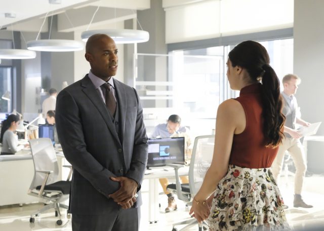 Regardless, the only action of sorts this week took place while Kara was at L-Corp, which she happened to be at right when Mercy attacks with a team of hired guns, in an effort to steal Lena’s new Lex-o-suit prototype (Kara’s subtle reaction to this hidden prototype is a nice nod that there will probably be more Lena/Supergirl disagreements in the season’s future!). This presented a semi-interesting idea, since Kara can’t just immediately intervene and save the day, on account of the building being in lockdown, and Lena constantly insisting that Kara would be safer around her. This was a very unexpected and interesting way for Kara’s civilian connections to end up working against her, and it was pretty funny to keep hearing Lena claim that Kara can only be safe next to her and Eve, with Lena obviously being completely oblivious to the fact that Kara is Supergirl. The only thing that somewhat ruined this otherwise interesting scenario is the fact that Kara’s attempts to disguise her identity are pretty terrible throughout this attack (she’s been pretty awful at hiding her powers throughout this entire series to date, it seems!), and every attempt she makes to stop the mercenaries is so laughably obvious, and happens so closely to Lena every time, that Kara should have been busted several times over. Lena’s supposed to be a genius, a Luthor, and yet she just completely swallows Kara’s obvious bullshit lie about Mercy hiring lousy shots?! Come on!