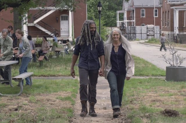 The Kingdom, meanwhile, had the smaller storyline this week, but it did give us a good chance to pick up with Carol and Ezekiel, who have now fully adopted a teenage Henry, and have since gotten married. Carol is now gentler and more outgoing, even taking Henry out to go meet up with Daryl for some unknown mission (sadly, a brief cameo towards the end is all we see of Daryl in this episode, suggesting that he’s since become a lone survivor that has since broken away from Alexandria), giving us a look at how Henry and Carol have both changed quite a lot over the past six years. Well, somewhat anyway. Henry is still a bit of a moron, since he stupidly runs off to tend to a screaming woman, clearly setting himself and Carol up to get robbed by former displaced Saviors, who are practically feral now, since Sanctuary apparently fell at some point in the six-year time gap. Carol seemingly allows Jed and Regina, along with the other Saviors, to rob her, trying to set a peaceful example for Henry… Only to later track the Saviors down and burn them alive for their robbery! Yikes! It was pretty intense to see just how violent Carol is still capable of being, even being a more outwardly gentle and loving ‘queen’ of The Kingdom now, with this horrifying scene also providing a convenient excuse to kill off Jed and Regina, the last remaining Savior lieutenants, now that Laura has joined Alexandria. Still, has Henry seriously not been trained to be more cautious than this? He’s supposed to be the son of the king, after all!