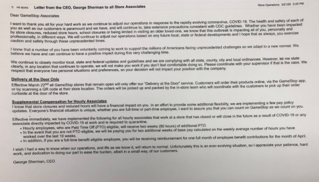 In a letter to employees released Saturday evening and obtained by Kotaku, CEO George Sherman says that the company will also be giving employees up to 80 hours additional paid time off or two weeks extra pay during this time. Again, this seems like a half-step in which the company should be paying employees throughout the store closures, especially as this ordeal is likely to last far longer than two weeks.