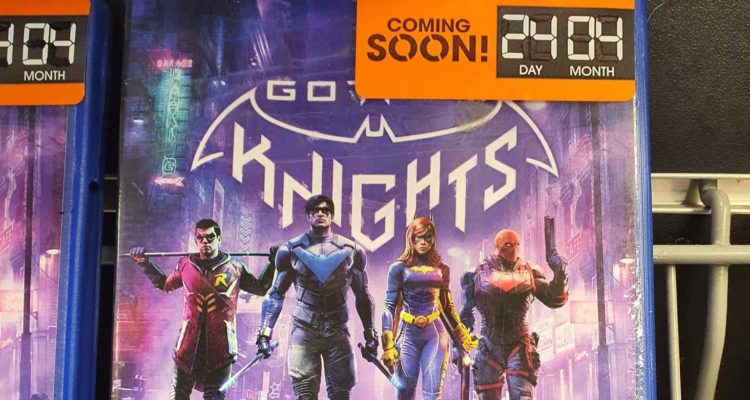 An image, shared by Twitter user @HogwartsLegacyN, shows placeholder game cases with Gotham Knights cover art and stickers reading “Coming Soon 24 04” on them.