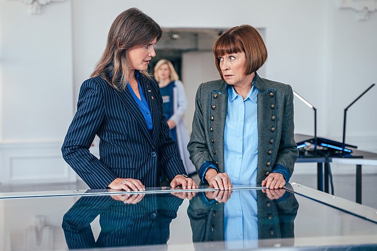 Unfortunately, these heartwarming reunions between legacy Doctors and companions nonetheless remain undermined by an over-reliance on Deus Ex Machina’s throughout this episode. Most notably, the Doctor’s A.I. hologram is literally able to bounce around and fix things as the plot demands. An especially convenient Deus Ex Machina also comes via the surprise return of one of the Thirteenth Doctor’s own former companions around this point, Graham, who literally just appears out of nowhere in a Bolivian volcano to meet Ace! How in the bluest of hells did Graham get there without the Doctor’s help?! As cute as it is to see a hint of an off-screen romance forming between Graham and Ace, one that will surely continue after Graham hosts a support group for former companions (a moment that features yet more Classic Who companion cameos, as Bonnie Langford, Katy Manning and William Russell reprise their roles as Melanie, Jo and Ian, respectively during this scene), there’s still a few too many quick, easy solutions for such a definitive plot by the Master in this regeneration special. This hurts the Thirteenth Doctor’s final adventure much more than it should.