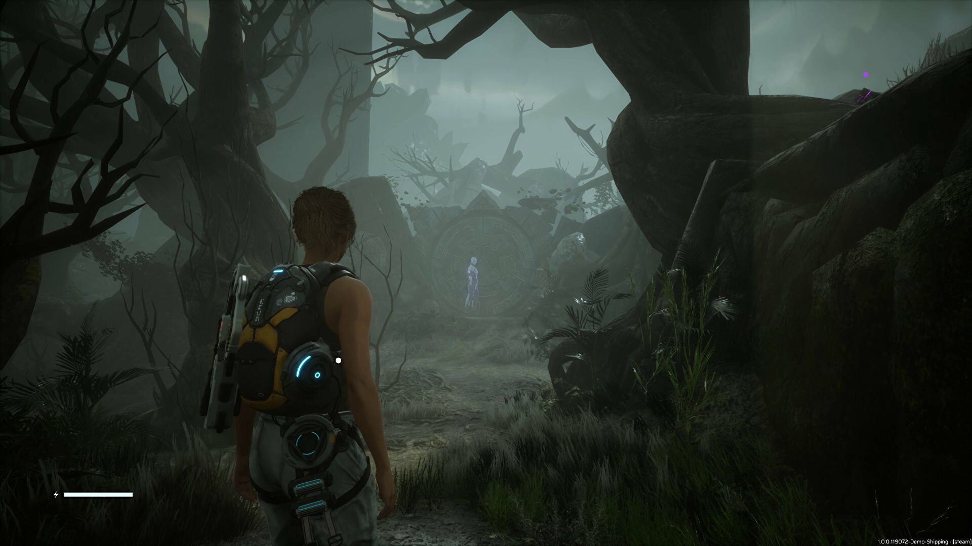 Minutes later, our protagonist — Dr. Kate — awakens on a strange alien planet and finds that she’s alone, not to mention confused. She does, however, find an energy weapon and a melee one, too, foreshadowing what players will soon be doing. After that, this Souls-inspired third-person shooter truly begins.