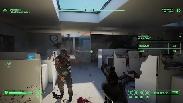 Even during ‘main’ missions, which involve going places and dealing with disturbances, gangs, etc. players will find some side objectives they can take on. Doing so will earn them extra experience points, and lead to a better mission grade at the end. Said experience points can then combine to unlock upgrade points, which can be used in the game’s skill tree. It allows you to upgrade different facets and abilities, like RoboCop‘s vitality, armor, focus, deception, social skills, damage and engineering, the latter of which is used to hack turrets. I would recommend focusing on vitality, armor and damage, because those will help you most and are the most important. I found that the first boss was quite challenging, but when I faced two of them later on it wasn’t too bad, because I became a lot more like a tank in the time between encounters.