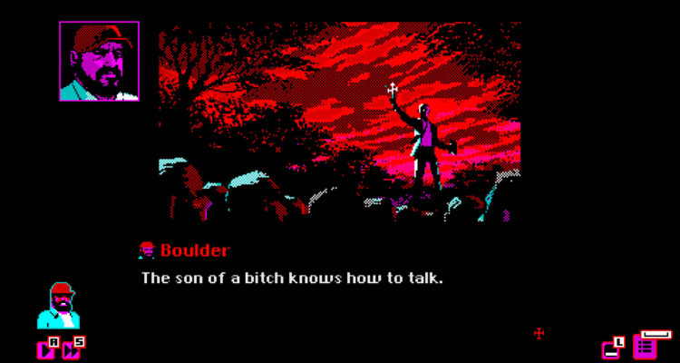 In Bahnsen Knights, players assume the role of an undercover investigator named Boulder, who’s left his wife and child at home to infiltrate a religious cult. He’s done so in order to discover what happened to his good friend, and his daughter’s godfather, Cupra.